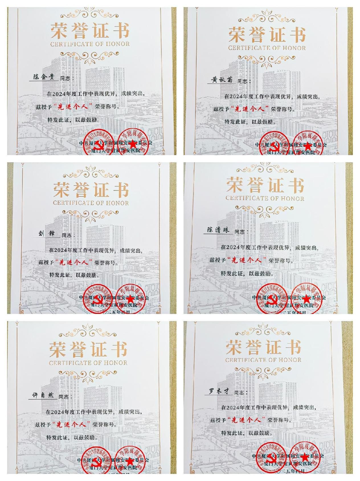 厦门大学附属翔安医院给公司员工颁发“先进个人”荣誉证书