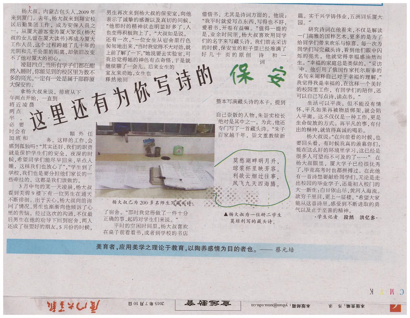 平时的空闲时间里,他喜欢在桌子前看看书,或者到学校的书店借借书,尤其是诗词方面的。他说:“我平时就爱写点东西,写得也不好,爱看书,开卷有益嘛。”值得一提的是,业余时间里,杨大叔喜欢用同学们的名字来写藏头诗。我们前去采访的时候,保安室的柜子里已经堆满了好几十页的原创诗词和一整本写满藏头诗的本子。提到自己崇敬的人物,朱崇实校长绝对是其中之一。为此,他还专门写了一首藏头诗。“朱子百家越千年,崇文重教续新篇。实干兴学铸伟业,五洲同乐厦大园。”