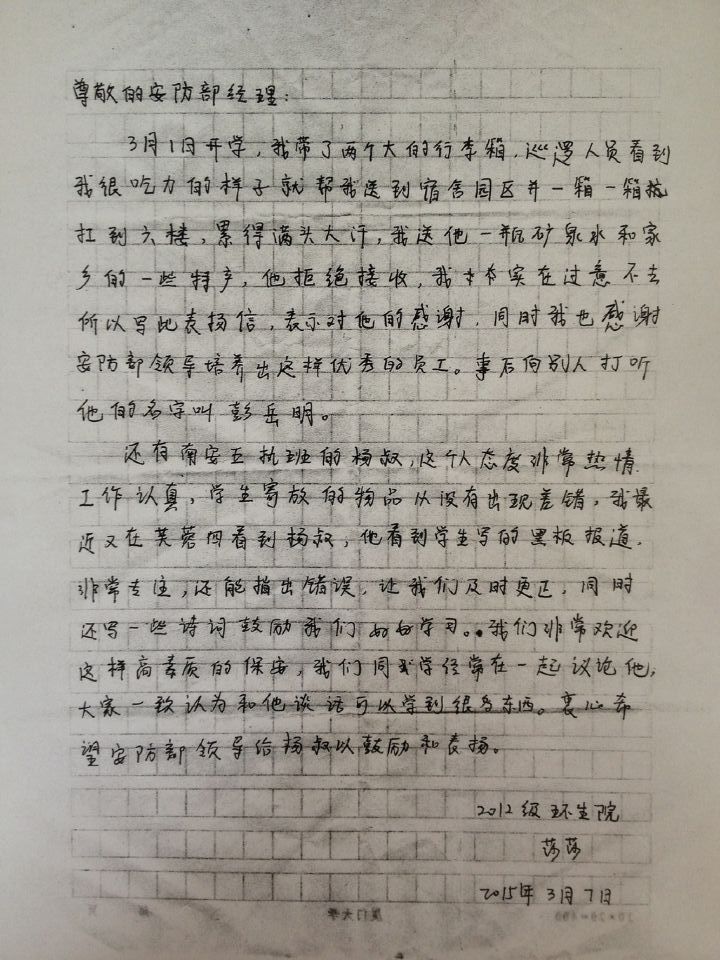 表扬信 尊敬的安防部经理: 3月1日开学,我带了两个大的行李箱,巡逻人员看到我很吃力的样子就帮我送到宿舍园区并一箱一箱扛到六楼,累得满头大汗,我送他一瓶矿泉水和家乡的一些特产,他拒绝接收,我实在过意不去。所以写此表扬信,表示对他的感谢,同时我也感谢安防部领导培养出这样优秀的员工。事后向别人打听他的名字叫彭岳明。 还有南安五执班的杨叔,这个人态度非常热情,工作认真,学生寄放的物品从没有出现差错,我最近又在芙蓉四看到杨叔,他看到学生写的黑板报道,非常专注,还能指出错误,让我们及时更正,同时还写一些诗词鼓励我们好好学习。我们非常欢迎这样高素质的保安,我们同学经常在一起议论他,大家一致认为和他谈话可以学到很多东西。衷心希望安防部领导给杨叔以鼓励和表扬。 2012级环生院 莎莎 2015年3月7日