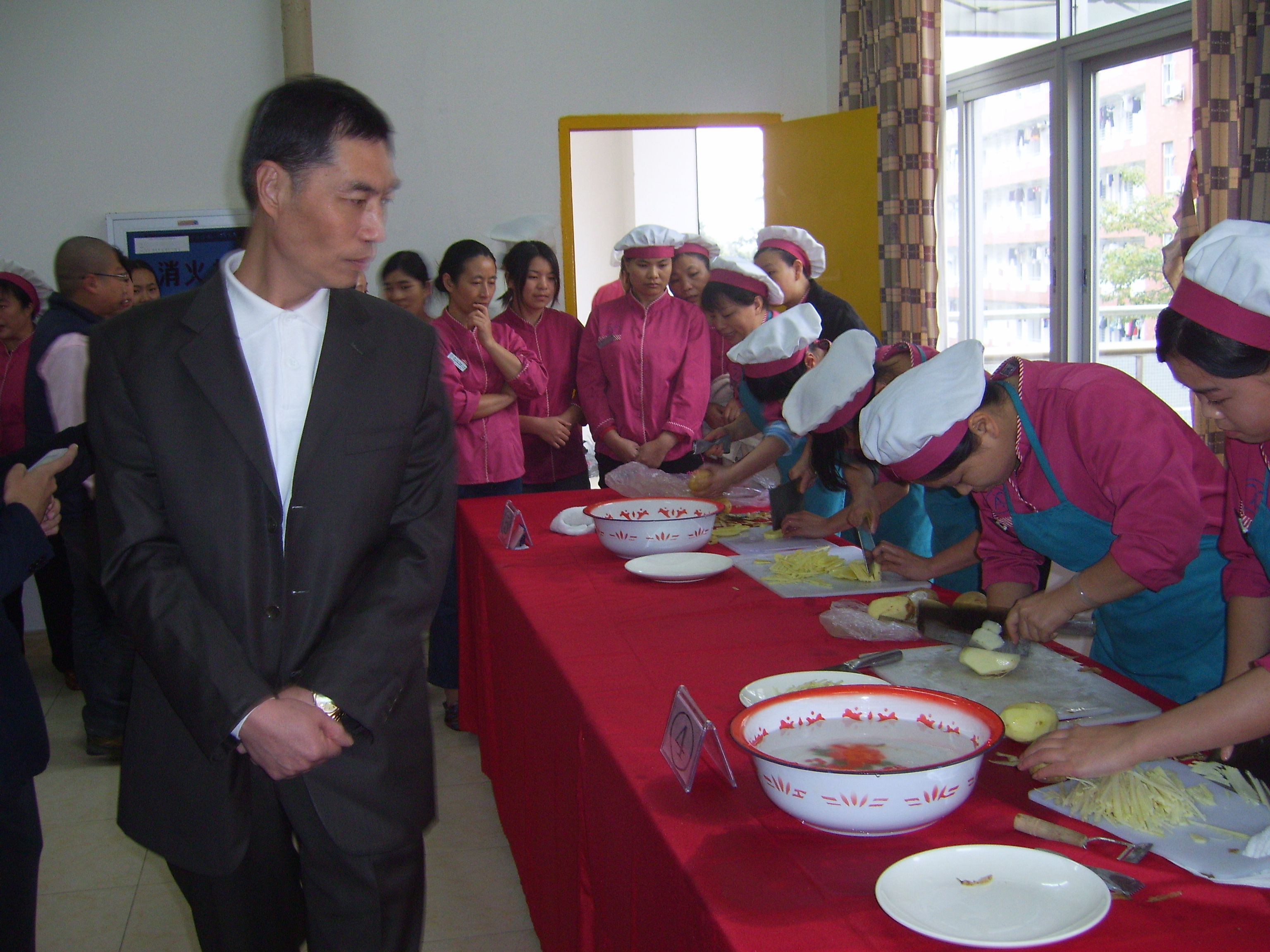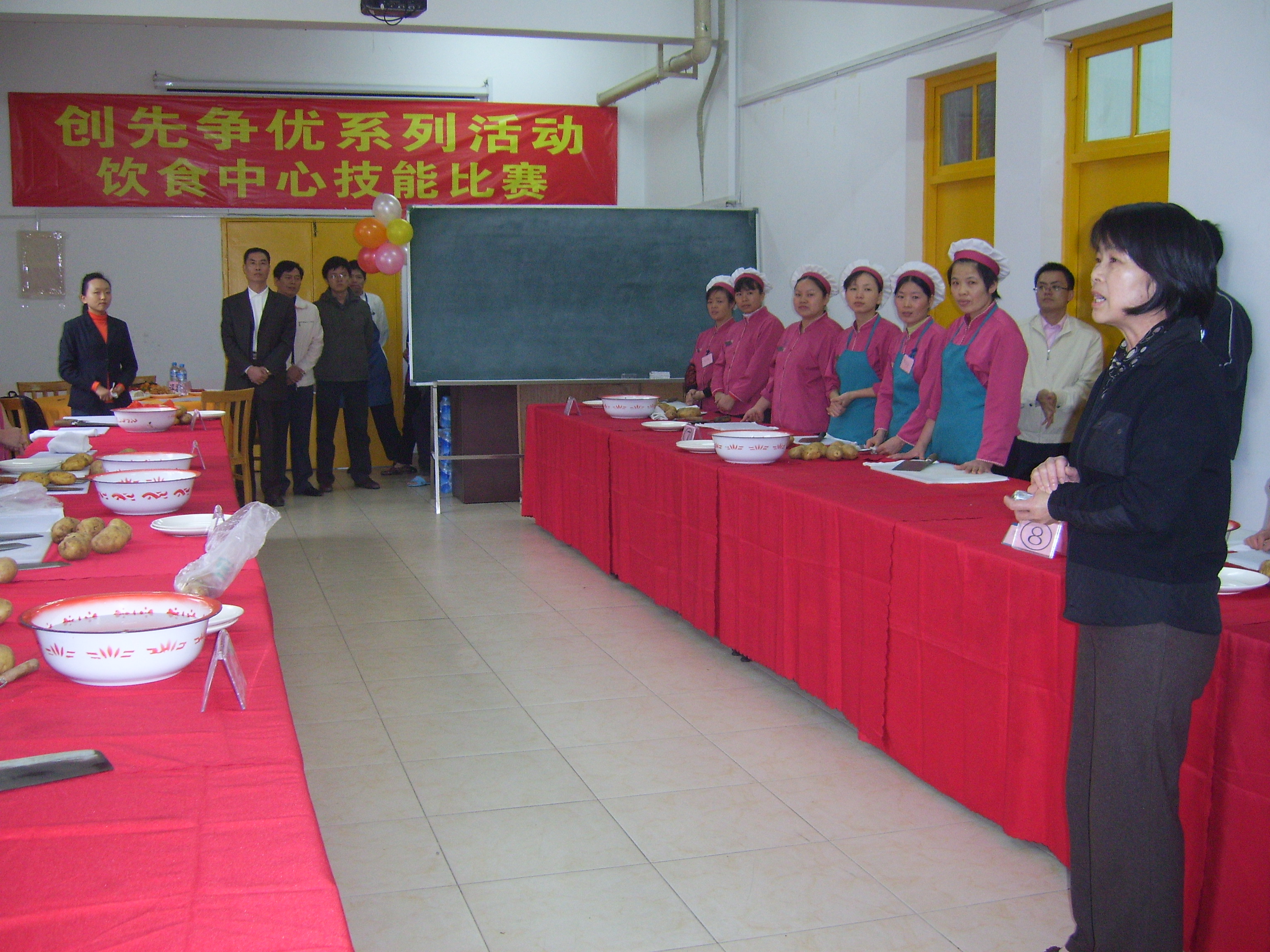饮食服务中心举行技能比赛 2010年12月10日中午,饮食服务中心在芙蓉餐厅三楼举行创先争优系列活动之饮食服务中心技能比赛。本次比赛由饮食服务中心团总支组织实施,目的在于通过本次比赛,展示员工厨艺技能,增强员工团队精神,进一步展现餐厅员工以实际行动在本职岗位上创先争优的良好风貌。 本次技能比赛分为团体比赛和个人比赛两类,团体赛由校本部8家餐厅(勤业餐厅、凌云餐厅、东苑餐厅、芙蓉餐厅、海滨餐厅、公寓一餐厅、公寓二餐厅、海韵园餐厅),漳州校区三家餐厅(北区餐厅、中区餐厅、南区餐厅)以及校外餐厅各一支代表队参赛,个人赛由各餐厅选派选手参加。为了增进餐厅与学生之间的交流,本次比赛还专门邀请校学生会权益部两名干事担任评委。 下午2点,比赛开始,选手们眼疾手快,刀工娴熟,切出来的土豆丝粗细均匀,土豆丁大小匀称。比赛结束后,中心副主任张金满、支部书记陈主伟、办公室主任王涛、团总支书记王湘等为比赛的优胜者颁发了奖状和奖品。 集团党总支书记叶鹏飞,党总支副书记庄惠美和集团团委书记林琳莅临现场观摩了比赛。 饮食服务中心团总支:王 湘