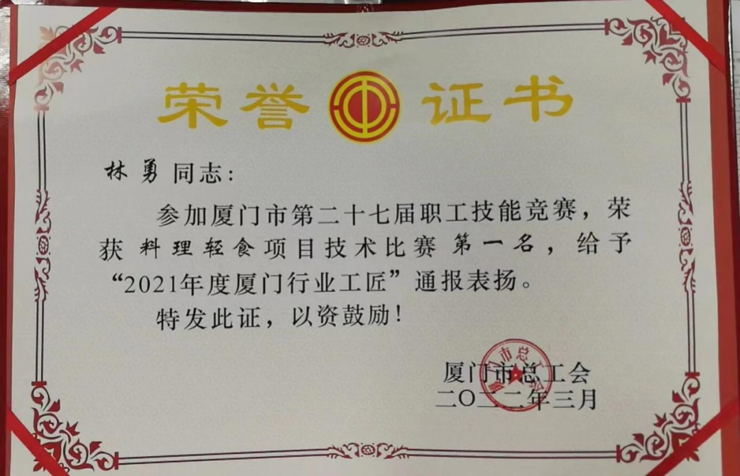 厦门市第二十七届职工技能竞赛中,林勇老师凭借其扎实的技艺、让美食凝聚舌尖,荣获了料理轻食项目技术比赛的第一名,由厦门市总工会授予“2021年度厦门行业工匠”的荣誉称号,喜获荣誉证书。