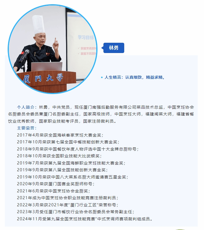30多年来,林勇老师曾在多家五星级酒店担任要职,后转为从事烹饪教学工作,具有丰富的实践经验和教学经验。作为福建省餐饮业优秀教师,他精益求精,不断提升自身技能与素养的同时,大胆创新并研发新菜品,取得显著的工作业绩。