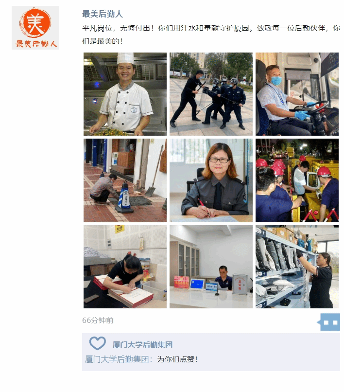 在明厨亮灶的食堂中,他们是烹饪美味的厨师;在干净整洁的长廊边,他们是清洁环境的保洁员;在安全无忧的宿舍里,他们是温馨守护的宿管员;在青翠欲滴的绿茵上,他们是修剪枝叶的园丁们;他们也是水电维修员、物业管理员、校门安防员、班车驾驶员、印刷试卷与分拣快递的工作人员……在厦园的每处风景中,他们奔赴在敬业的道路上不停歇,为师生的学习生活保驾护航,为建设校园的美好环境贡献力量。他们是校园里最平凡的一群人,却用最朴实的言语、最切实的行动,诠释责任担当,守护着厦园的每一寸土地,温暖着每一位师生的心。