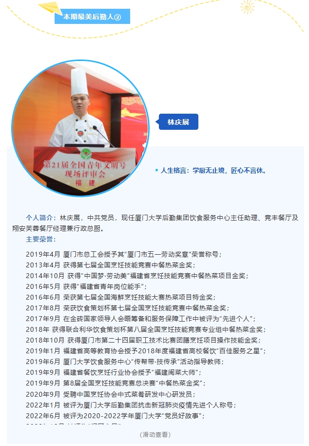 “下课啦!走,去丰庭吃饭!”说起丰庭餐厅的菜品,翔安校区的师生纷纷竖起大拇指,2021年,为提升翔安校区丰庭餐厅菜品,林庆展到翔安校区丰庭餐厅出任副经理兼行政总厨,带领餐厅员工逐步推进菜品口味、菜品花样、厨师技术、服务培训等方面的改革创新,增添了一品卤锅、羊肉煲、轻食等各色花样。2022年5月底,丰庭餐厅推出二楼“轻食”窗口,林庆展把该窗口同国家级“营养健康食堂”评选活动有机结合起来,打造厦大餐饮品牌美誉度,餐厅因此获评“顾客满意的全国营养健康食堂”殊荣。