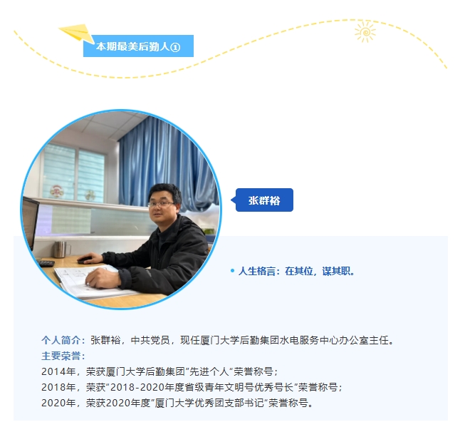 “践行‘12345’管理服务理念,是我们为更好地服务师生的创新举措之一。”张群裕介绍道,“12345”即:“一心”,一心一意服务师生;“二回”,师生连续两次拨打维修热线无法拨通的,维修部随即回拨;“三先”,先思考、先发现、先解决;“四勤”,勤巡检、勤维护、勤沟通、勤学习;“五点”,微笑多一点、行动快一点、推诿少一点、服务细一点、处事周到一点。秉持良好的服务理念,张群裕积极参加各类志愿者活动。