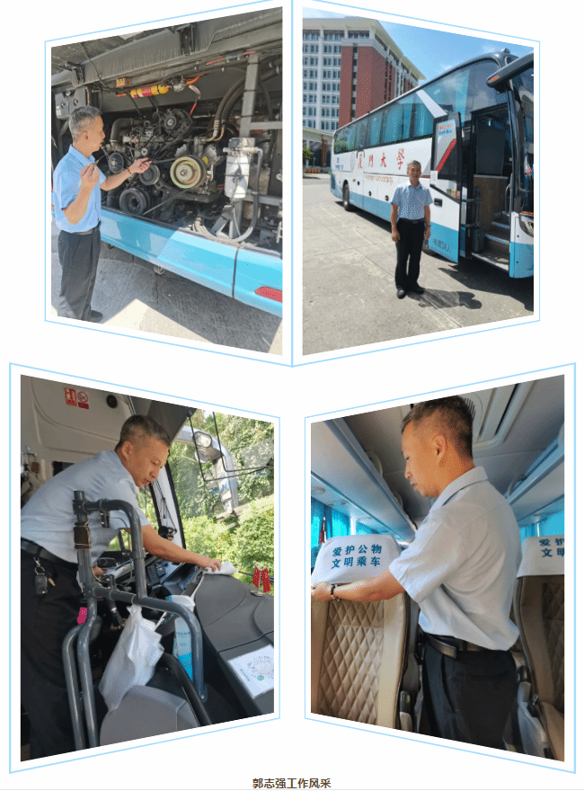 除此之外,在每年的迎新、开学典礼、军训等大型运输保障任务中,郭志强同志始终坚持着为师生服务的初心,主动帮新生提行李,贴心地为乘车师生准备好一次性塑料袋、藿香正气水等应急物资以备不时之需,用真心、细心、贴心在十二米车厢里传递着温暖,用赤诚之心伴随着师生一路同行,也赢得了师生的一致好评。