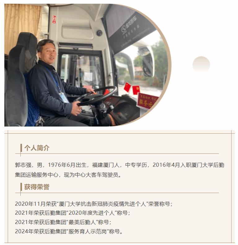 郭志强同志为人诚恳踏实,虽不善言词,却总是默默付出,不计较个人得失。每次大型运输任务,总能冲锋在前,不管任务排得多晚,见到他时脸上总挂着一副温暖的笑容。2020年,病毒肆虐的危险时期,正是欢聚一堂的春节时刻,原本执行班车任务的驾驶师傅暂时无法回厦,中心在工作群中发出通知后,连续两年春节执勤的郭志强同志自告奋勇,放弃休假,火速到岗。他的家人表示好不容易今年春节可以一起在家过年,他却说我是中心的一份子,更是一名入党积极分子,坚守阵地是我的职责和使命。在疫情严重、各项工作陆续部署的时候,郭志强同志积极配合学校、集团政策,反应迅速,肩负起为乘车教职工测量体温的工作。他耐心地为每一位乘车老师进行体温检测,温馨地提示每一位乘车老师佩戴口罩乘车;车辆运行途中,他时常提醒老师们做好个人防护;完成每一趟任务后,他严格落实“每趟消毒,每班通风”,为一车师生提供安全安心的乘车环境。