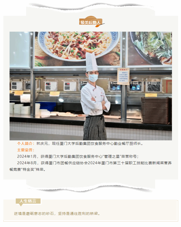 林庆元就是这样一位从基层成长、一边勤恳学习一边精进技艺的后勤员工。他不忘初心、谦虚谨慎,敢于管理、勇于创新,带头扎根一线岗位,传承饮食服务精神、育人使命,助力校园后勤饮食保障成为最美的风景线。