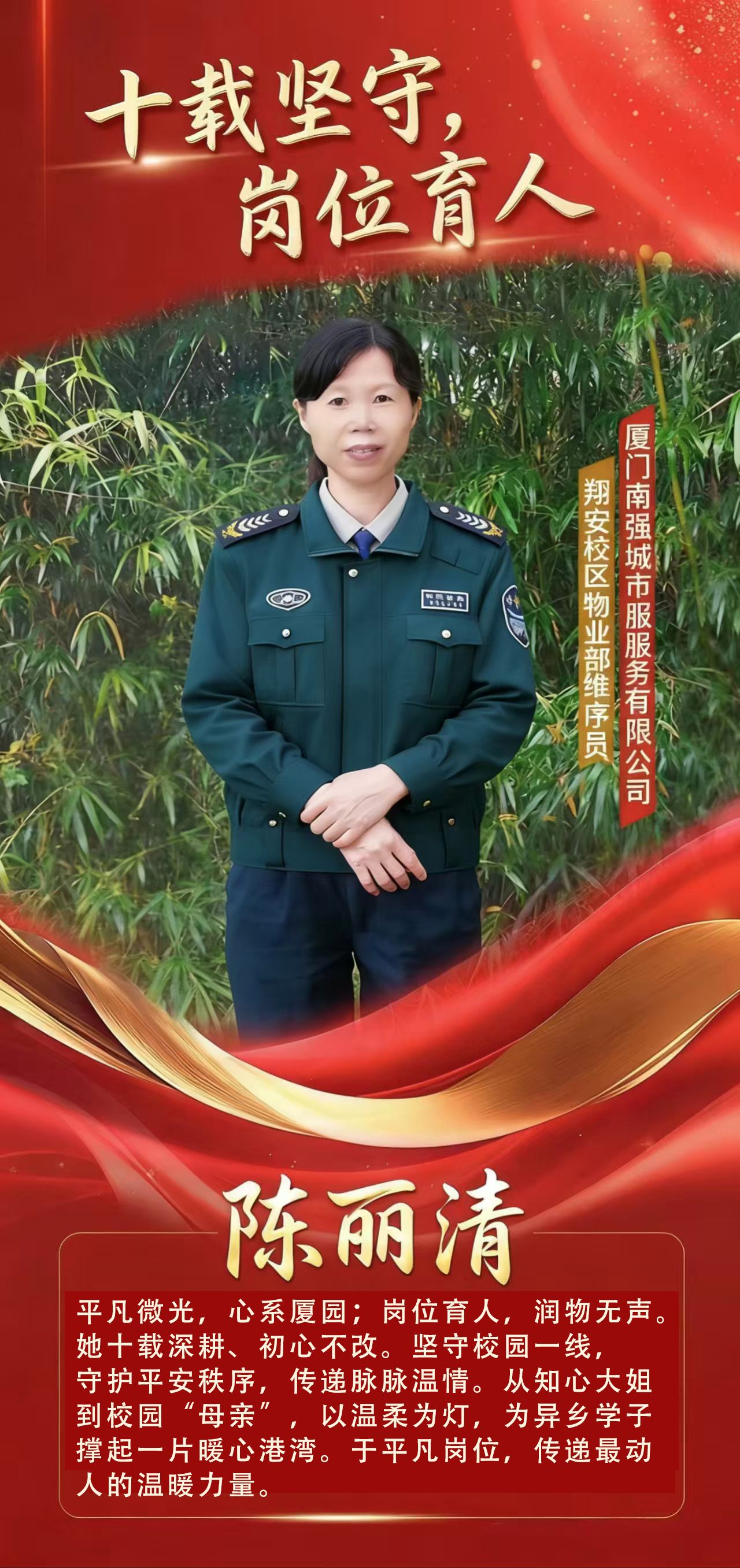 陈丽清扎根校园,她熟悉学院的每一处角落,早已将这里当作自己的家,把师生当作亲人。从“陈姐”这个亲切的称谓,到学生们心中信赖的“知心大姐”,她渐渐成为异乡学子最温暖的港湾。她将朴素善意融入日常坚守,她以真诚陪伴践行“岗位即责任,服务即育人”的初心,尽显南强城服立足校园、以情育人的温度。