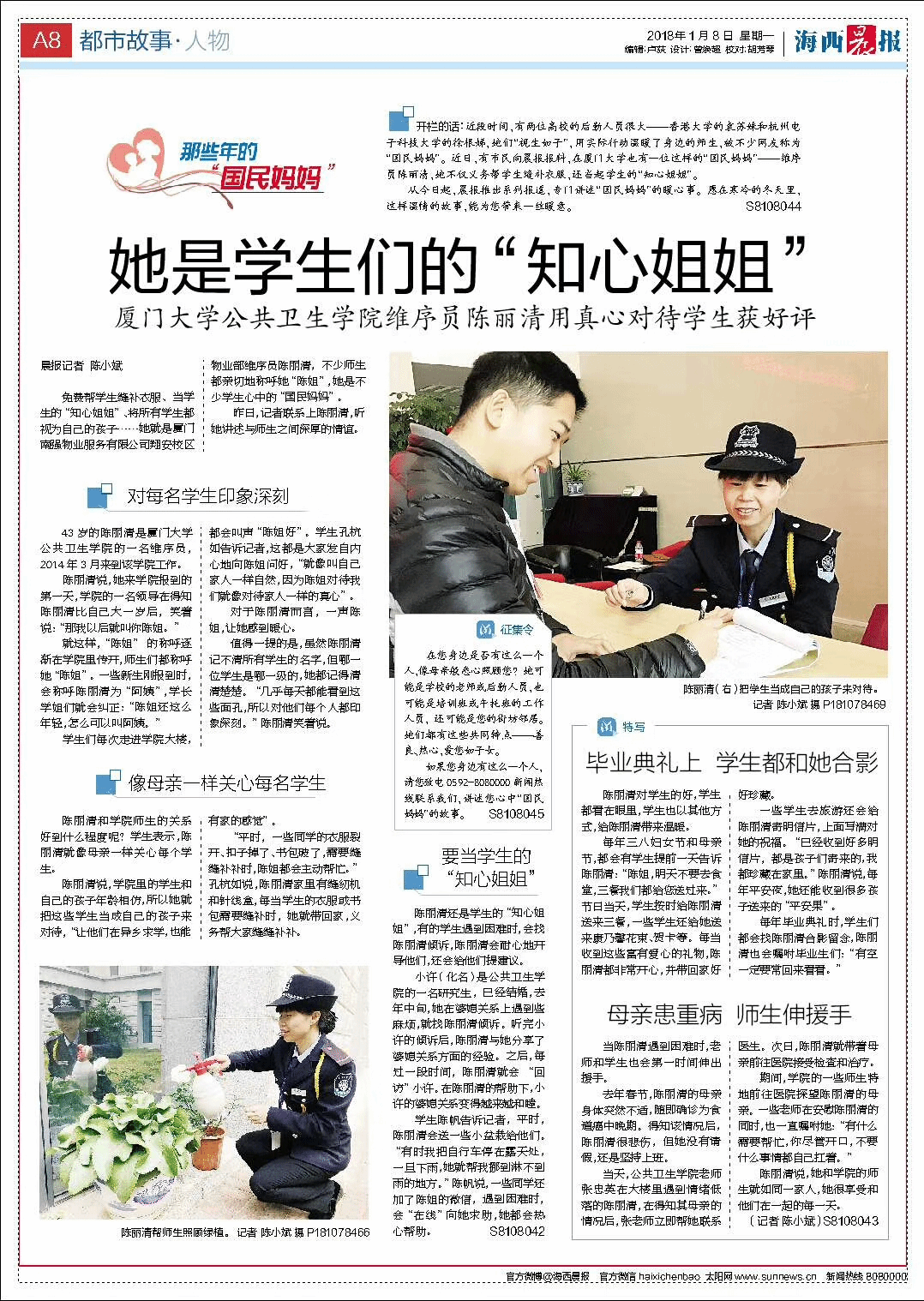 陈丽清的事迹也被《海西晨报》专题报道。面对荣誉,她依旧朴实而真诚:“能把每个服务细节做到位,就是最好的育人。”
