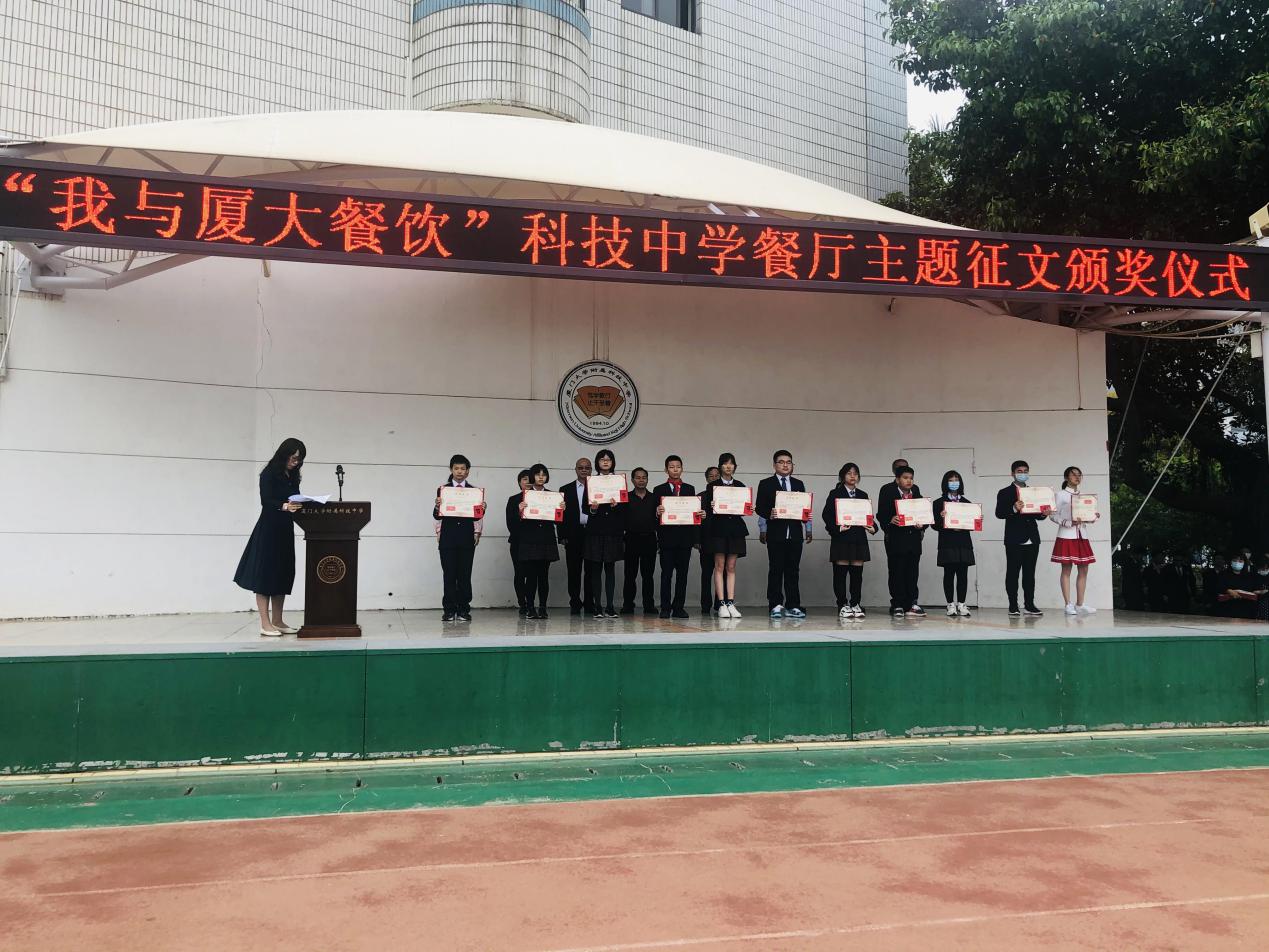 4月12日上午,科技中学举行“我与厦大餐饮”主题征文颁奖仪式,科技中学副校长许苹、吴忠露、钟灿富、倪子伟、傅强、祝国华和校工会主席杨望辉、总务主任王伟龄,南强后勤公司总经理罗阳、副总经理麻燕凌,为思明与翔安两个校区获奖的同学们颁发奖状与奖品。一蔬一饭皆是情,百年韵味聚舌尖。厦大餐饮之于科技中学的学子而言,是求学路上的精神陪伴,一种家的味道,一份浓厚的情怀。