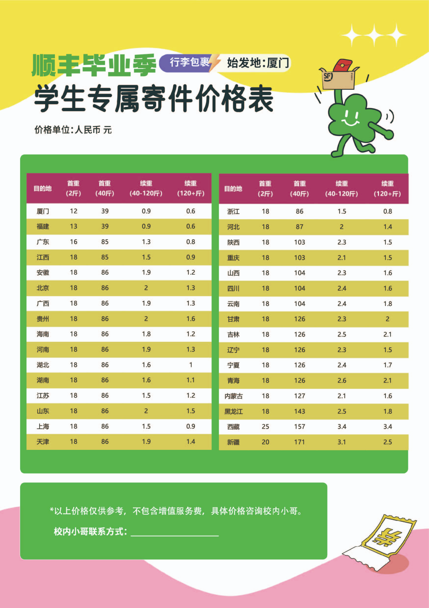 1. 请有需求的毕业生详细了解各快递物流服务单位所提供的服务项目与内容,了解各家业务的性价比及其适宜性,自行接洽、自主选择;注意索取并保管好业务凭证,以便消费维权。上述四家快递物流服务价格表详见附件,优惠政策仅限于集中服务期间(6月26日-7月2日)现场服务点收寄的行李包裹。