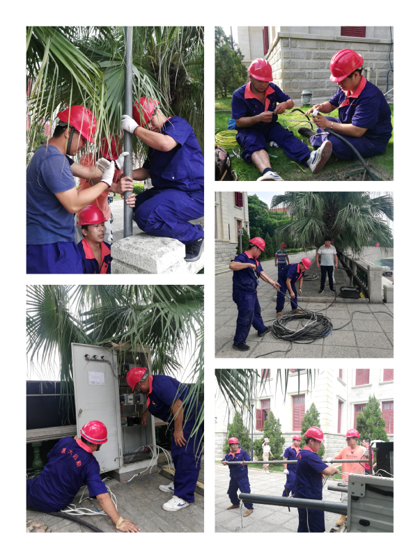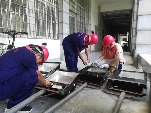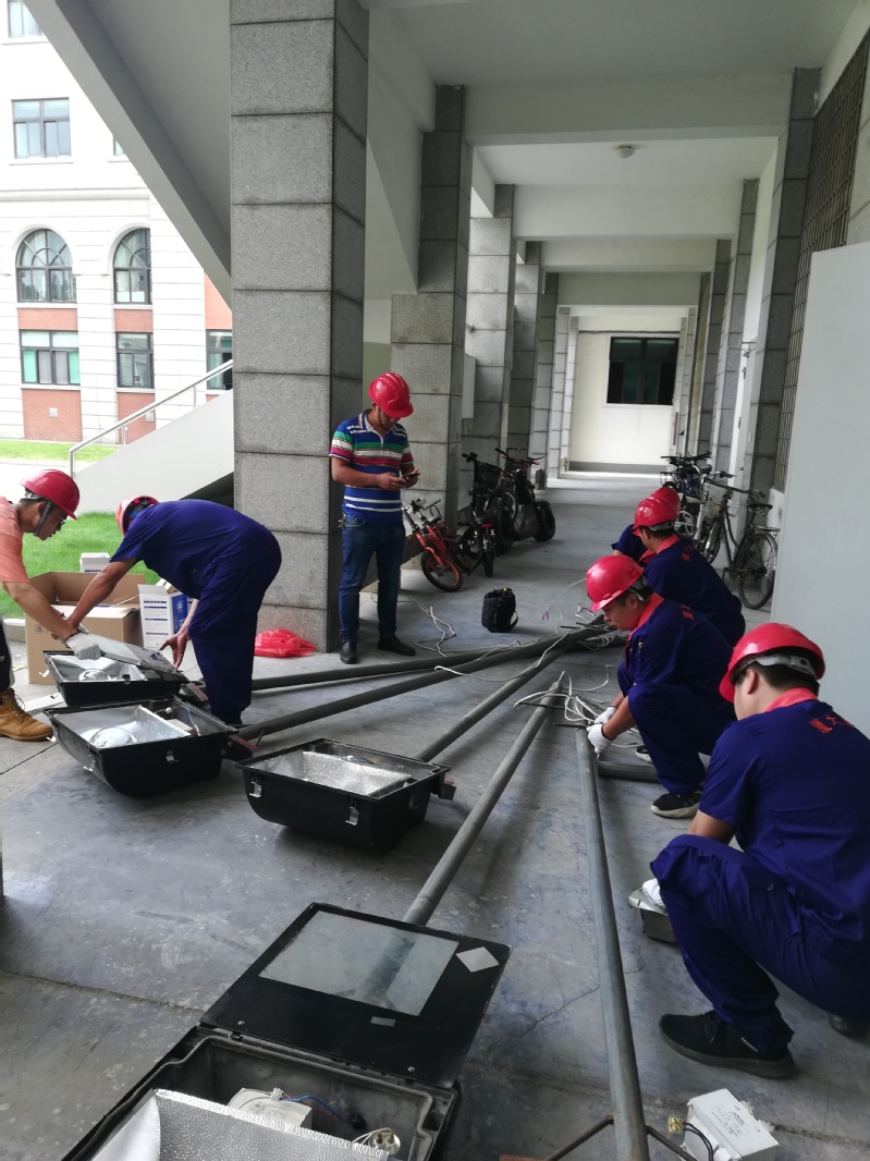 分工协作、认真调试检查照明设备,做好加装军训照明设备准备工作