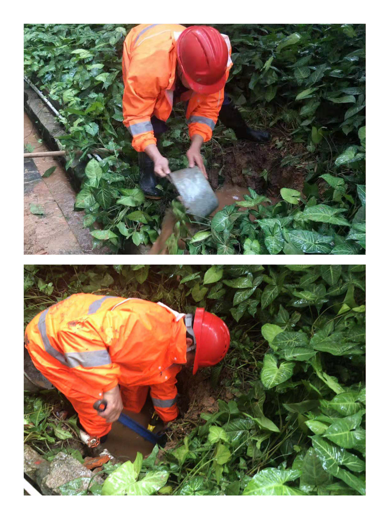 芙蓉三进水管漏水点位处花圃之下,因连日降雨导致土质泥泞湿滑,不断有滑落的泥水积蓄在水管周围,抢修过程中维修师傅一边迅速进行抢修作业,一边不停清洁水管,抢修工作紧张而有序;成伟四进水管深埋演武路西侧人行道路下,路面有多处冒水点,维修师傅凭借多年经验快速预判并准确挖到漏水点,大大缩短抢修时间;为保障用户们的正常用水,他们雨中坚持作业,牺牲午休时间加班加点开展抢修工作,他们忙碌的身影成为雨幕中最动人的风景。