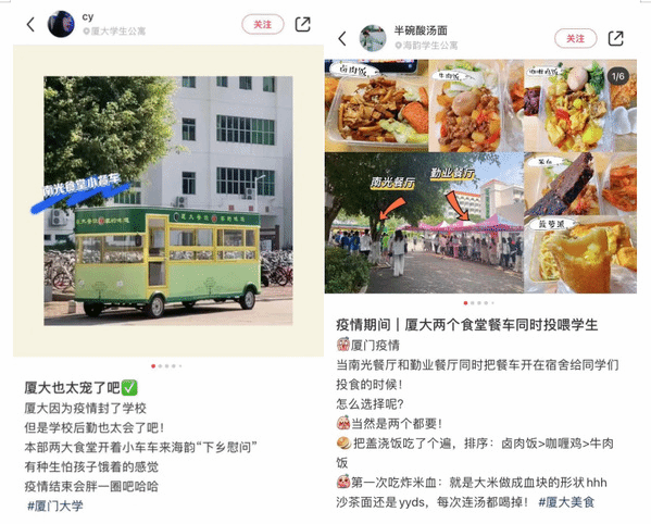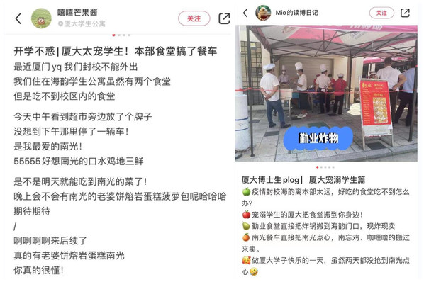 “南光餐厅移动餐车推出主食盖浇饭、沙茶面、炒牛河等,还有南忘鸡、老婆饼、熔岩蛋糕等爱吃的点心……”“勤业餐厅现炸现卖炸全翅、脆皮鸡腿、炸鱿鱼……多达16种。”“相比这些,各餐厅增设水果、奶茶、煎鸡排、蛋糕等都不算什么了,这样下去真的会越来越胖。”“疫情后,吃餐厅的菜更频繁了,首先夸一下餐厅的物价,两荤一素才8元,真的无敌实惠了;还有勤业餐厅的沙茶面好吃,汤底更浓郁;喜欢酸汤口味的不要错过芙蓉餐厅的牛肉粉……”网络上,同学们纷纷留言,厦大食堂成为疫情期间校园里的一道靓丽风景线。