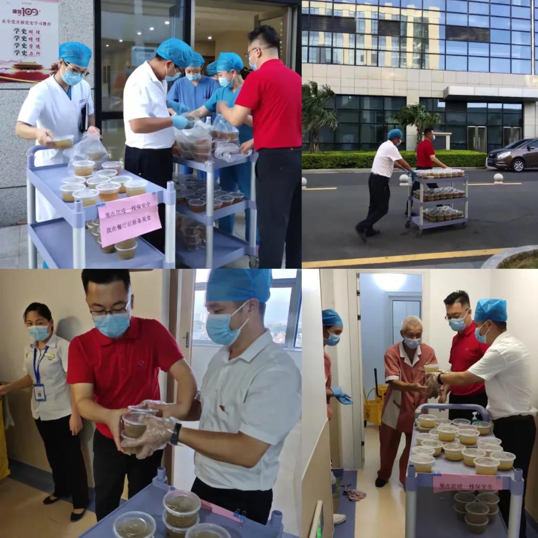 为了保障抗疫一线医务人员的用餐,餐厅人员24小时待命,排班执行四班倒,除一日三餐正常供餐外,还会在凌晨三点、四点时为仍在忙碌的医护人员提供夜宵,餐厅还时刻准备着,为随时需紧急驰援、奔赴一线的医务工作者打包送餐;翔安医院作为新冠病毒定点治疗医院后,餐厅就必须承担起为隔离区病患送餐的工作,餐厅每天安排专人定点定时送餐,9月的厦门依然炎热,但为保证安全,送餐人员必须身穿密不透风的防护服送餐,通常送一次餐,他们全身就会被汗湿透一次,而每日送餐次数高达十多次;同时,餐厅还不忘关怀医院里同样坚守岗位的其他后勤人员,在炎炎夏日里为他们送上免费绿豆汤、矿泉水、凉茶等。