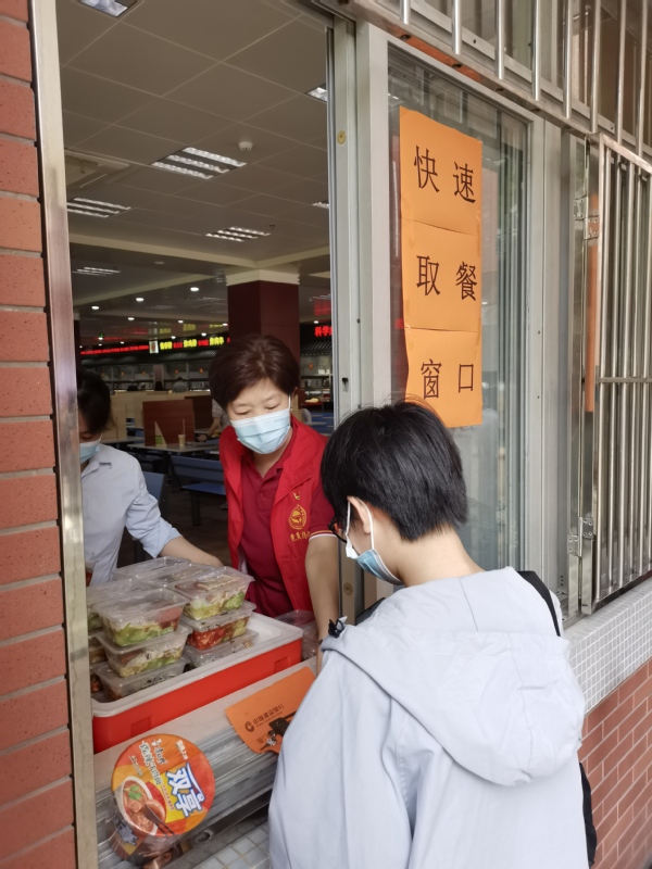 学校各食堂专门为防控开辟了快速取餐窗口。集团党委副书记邓泽君带头前往芙蓉餐厅支援,为师生刷卡、发放套餐,最大程度减少了师生在食堂的停留时间。