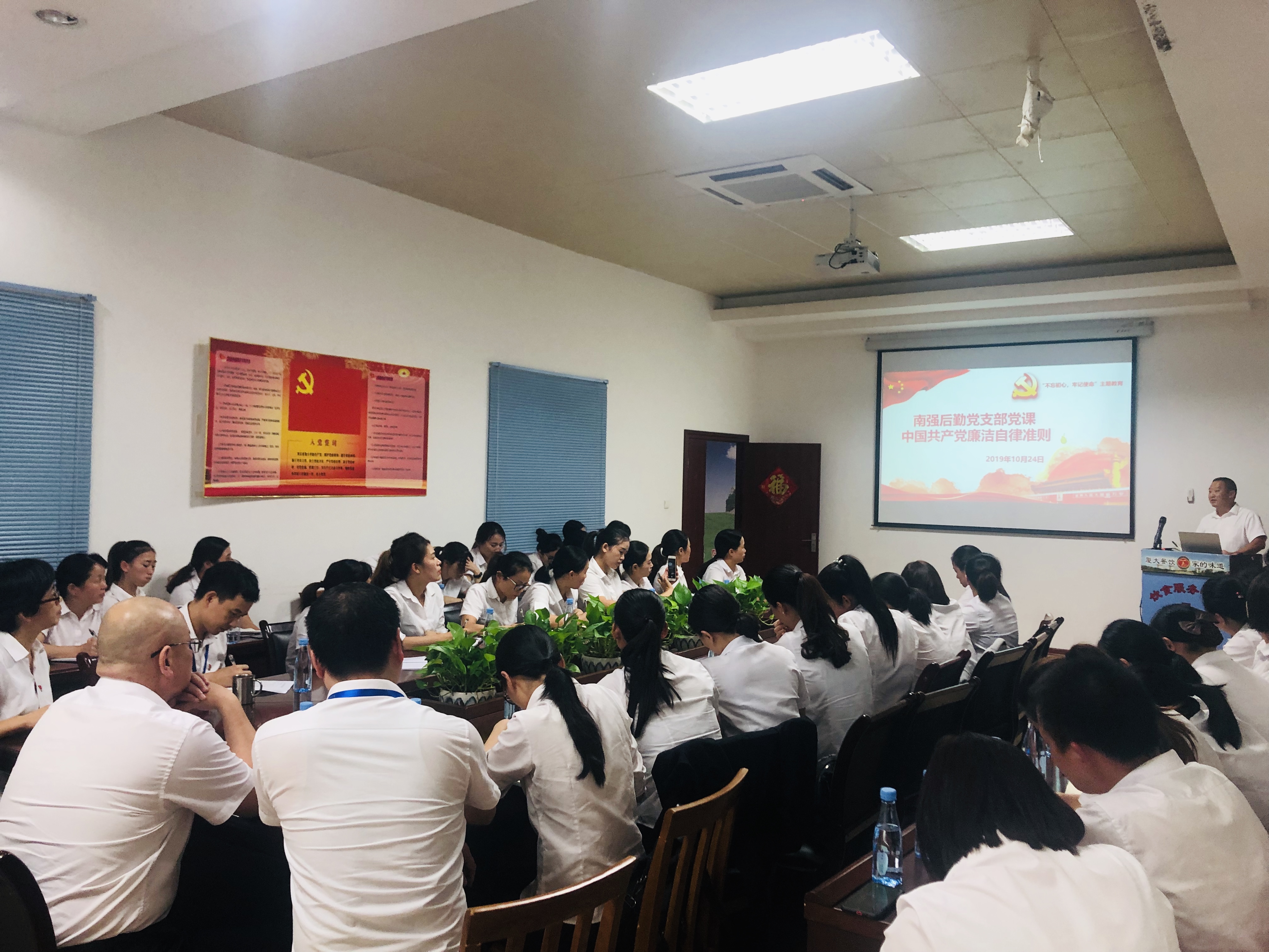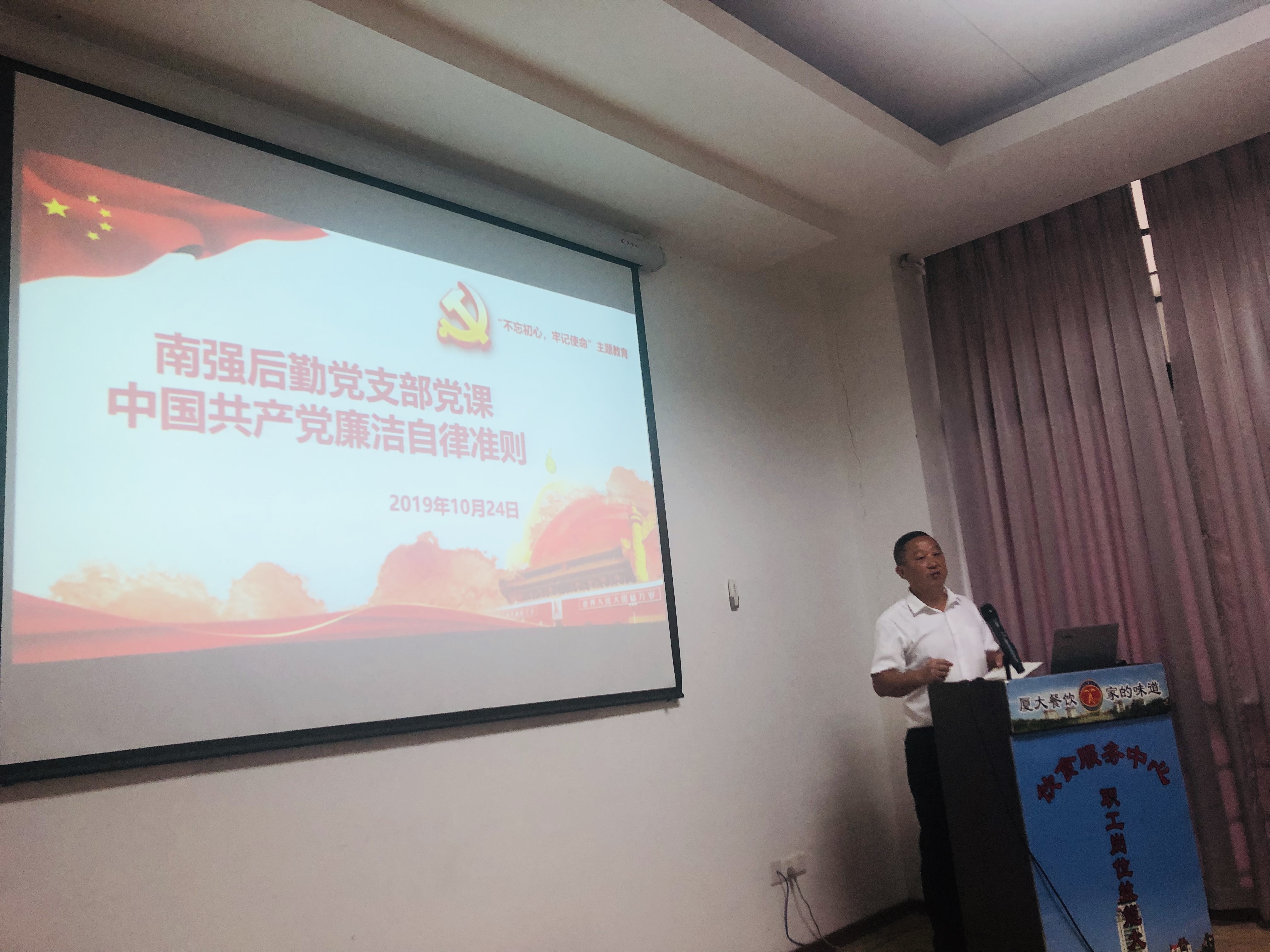10月24日下午4点,集团总经理林公明在饮食服务中心会议室为南强后勤党支部全体党员和公司各餐厅的保管上了一堂专题党课,为大家详细解读了《中国共产党廉洁自律准则》的内容。随后,在支部书记朱克萍的领学下,通过视频观看,大家共同学习了张富清同志的优秀事迹。10月25日,支部在党建E家APP上发布线上会议,进一步强化了全体党员的学习效果。