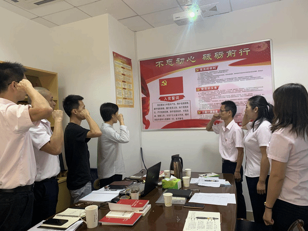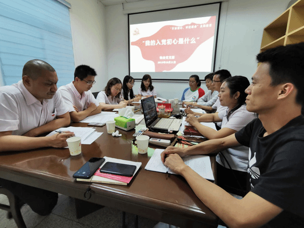 主题教育一开始,林振勇书记介绍了物业党支部系列主题教育的计划安排,并带头回忆起自己入党时的初心。各位党员同志畅所欲言,回忆自己的入党初心,大多数党员说是由于家庭的影响,从小在心里埋下了“共产党好”的种子,奠定了自己入党的信念,长大后在学习和工作中受老党员的影响,看到了党员的模范带头作用,更加坚定了自己入党的决心。在历尽艰难后终于成为正式党员的那份骄傲,每个党员现在说起来还神采飞扬。每个人入党的原因各不相同,但是向党靠拢的决心和对党的信仰是相同的。通过回忆入党初心,支部全体党员再一次坚定了自己入党的信念,有了信念就有了奋斗的目标,有了前进的方向;通过回忆入党初心,时刻提醒自己以党员的标准严格要求自己,以饱满的热情投入到工作中去。