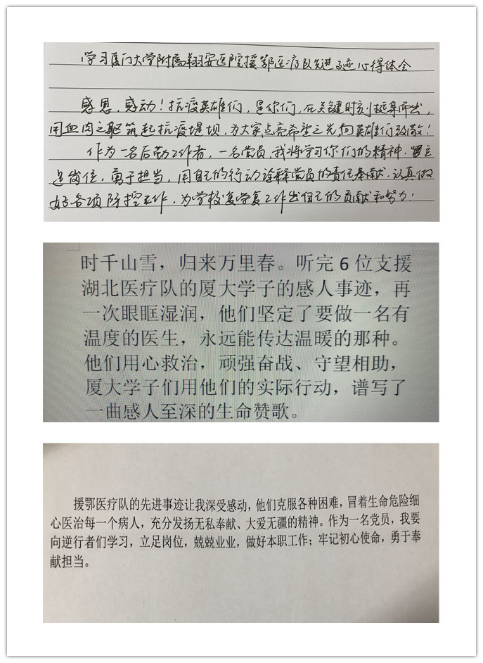 厦大附属翔安医院援鄂援汉医务人员是我们厦大人的骄傲,是我们后勤人的楷模,是广大党员干部的榜样,我们要努力学习他们:随时听从党的召唤,做好战斗准备,披甲逆行,奔赴党和人民最需要我们的地方,团结一致、顽强拼搏、坚持不檞,以满腔热情和精湛技能服务学校教学科研和师生生活。