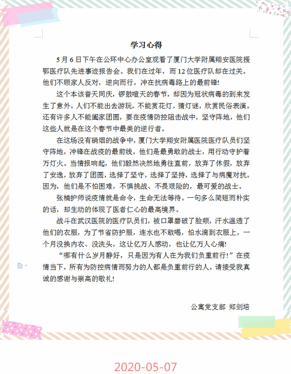 学校医院援鄂医疗团队的先进事迹让我收获满满,他们舍小家为大家、不顾个人安危勇往直前、不计较个人得失的精神是我们学习的榜样,在新时代、在建设“双一流”大学的工作中,我们需要的正是这种大爱精神,这种大公之情,这种忘我的投入。抗疫的胜利,给予了我们信心,给予了我们希望。我会努力学习。