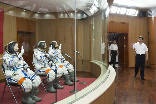 习近平来到航天员公寓问天阁,为即将出征的神舟十号航天员壮行。“你们这次执行的是我国第五次载人航天飞行任务,这承载着中华民族的航天梦。在此,我祝你们成功,期待你们凯旋。”