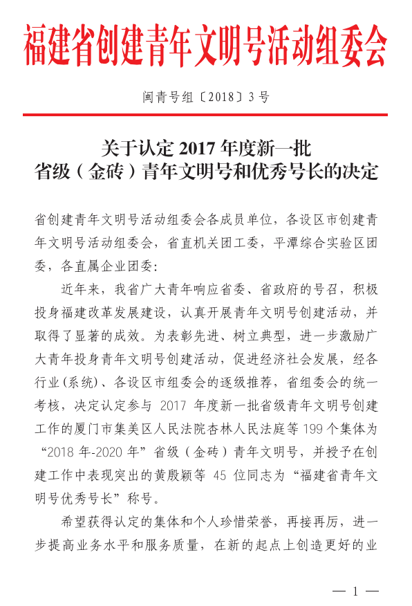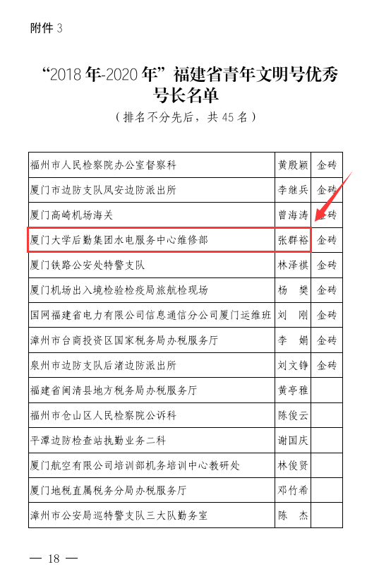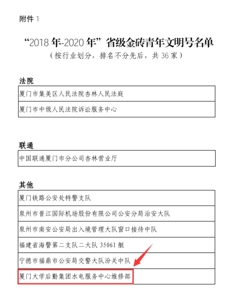 日前,在刚刚结束的2017年度新一批福建省青年文明号的创建评选工作中,厦门大学后勤集团水电服务中心维修部喜获“2018年-2020年省级金砖青年文明号”荣誉称号,成为厦门大学唯一获此殊荣的基层单位。厦门大学后勤集团水电服务中心维修部张群裕获得“2018年-2020年福建省青年文明号优秀号长”荣誉称号。