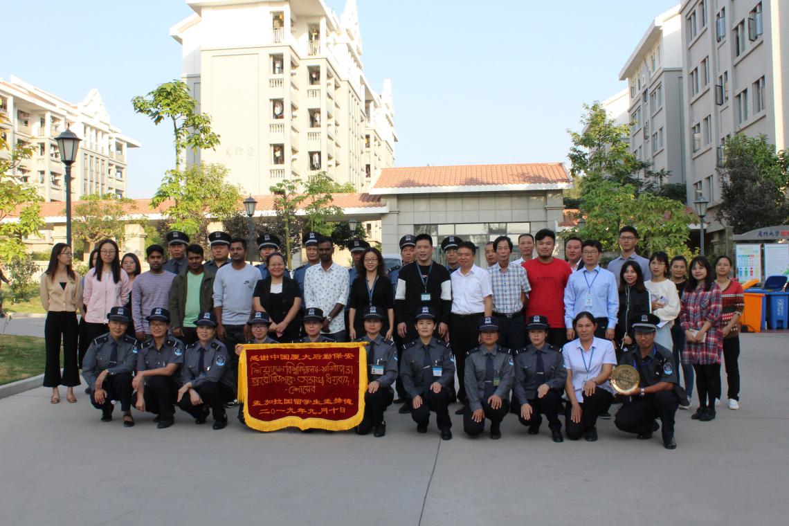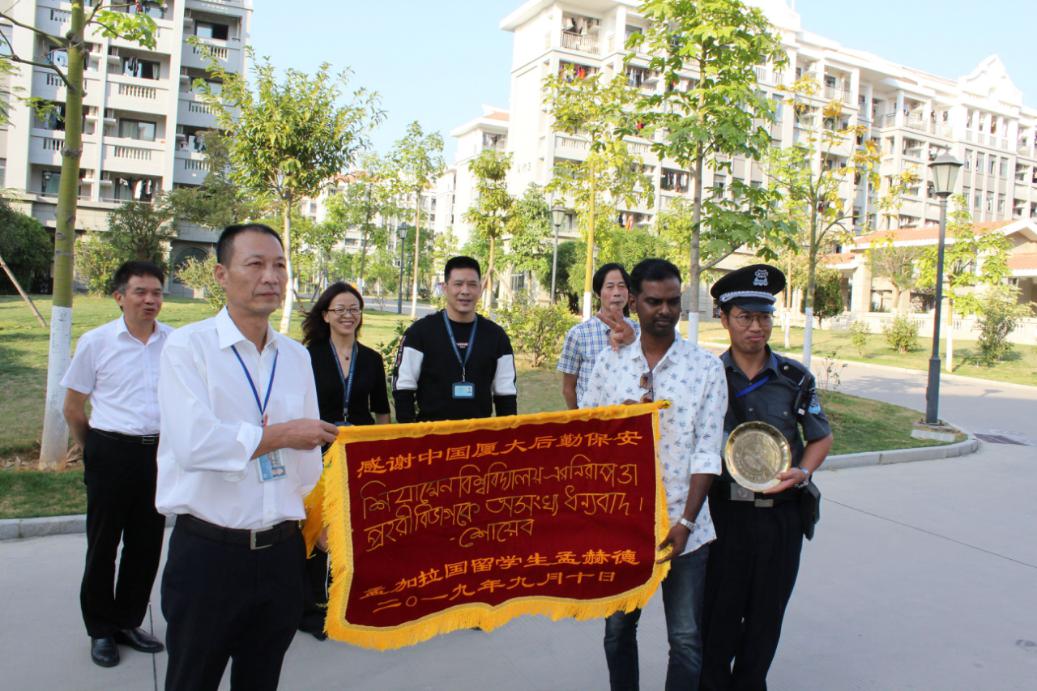 为感谢安防队员的辛勤付出和细致服务,海外教育学院孟加拉国本科生孟赫德代表部分留学生通过翔安校区管委会给后勤安防队送来一面“感谢中国厦大后勤保安”的锦旗,并向队员余永刚赠送了手工纪念锡盘。11月5日下午,赠旗赠盘仪式在二期笃行岗亭举行。翔安校区党工委副书记、管委会副主任黄宇霞,海外教育/国际学院党委副书记罗俊峰,翔安校区保卫办秘书陈荣瑞,海外教育/国际学院辅导员,部分学生及翔安校区服务办员工代表参加了本次活动。活动由后勤集团总经理助理、翔安校区服务办主任汪尚谦主持。