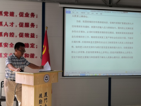 随后,王裕民副总经理给大家带来“党旗下的党课”——《国际歌》解读。他从《国际歌》的诞生背景、思想内涵与教育意义进行分析解读,引导大家要坚持马克思主义真理,在学思践悟中,充分发挥党员先锋模范作用和队伍凝聚力,以党建为引领,为保障学校疫情防控常态化和水电、运输安全构筑一道“红色防火墙”。