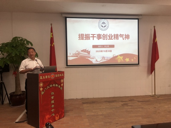 林公明还带领大家学习了党的十九届五中全会精神,要求校内外饮食全体人员认真学习、深刻领会全会精神,以昂扬向上的精气神奋进,打造一流后勤,迎接厦大百年校庆。