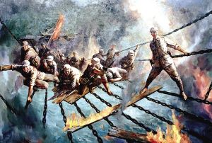 敌人的子弹打在铁索上叮当作响,有两名突击队员中弹坠入河中,但剩下的队员仍然奋勇前进……就这样,在震撼河谷的军号声、枪炮声和喊杀声中,突击队员攀着光溜溜的铁索一节一节地向东桥头匍匐前进,随后的部队在铁索桥上爬着铺设门板……