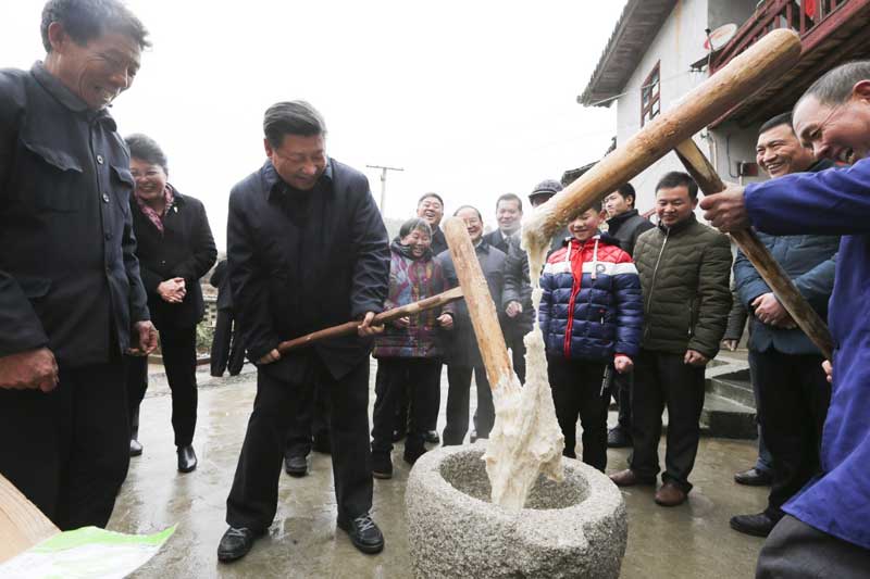 2016年2月1日至3日,中共中央总书记、国家主席、中央军委主席习近平来到江西,看望慰问广大干部群众和驻赣部队。这是2月2日,习近平在井冈山市茅坪乡神山村同村民一起打糍粑。新华社记者 兰红光 摄