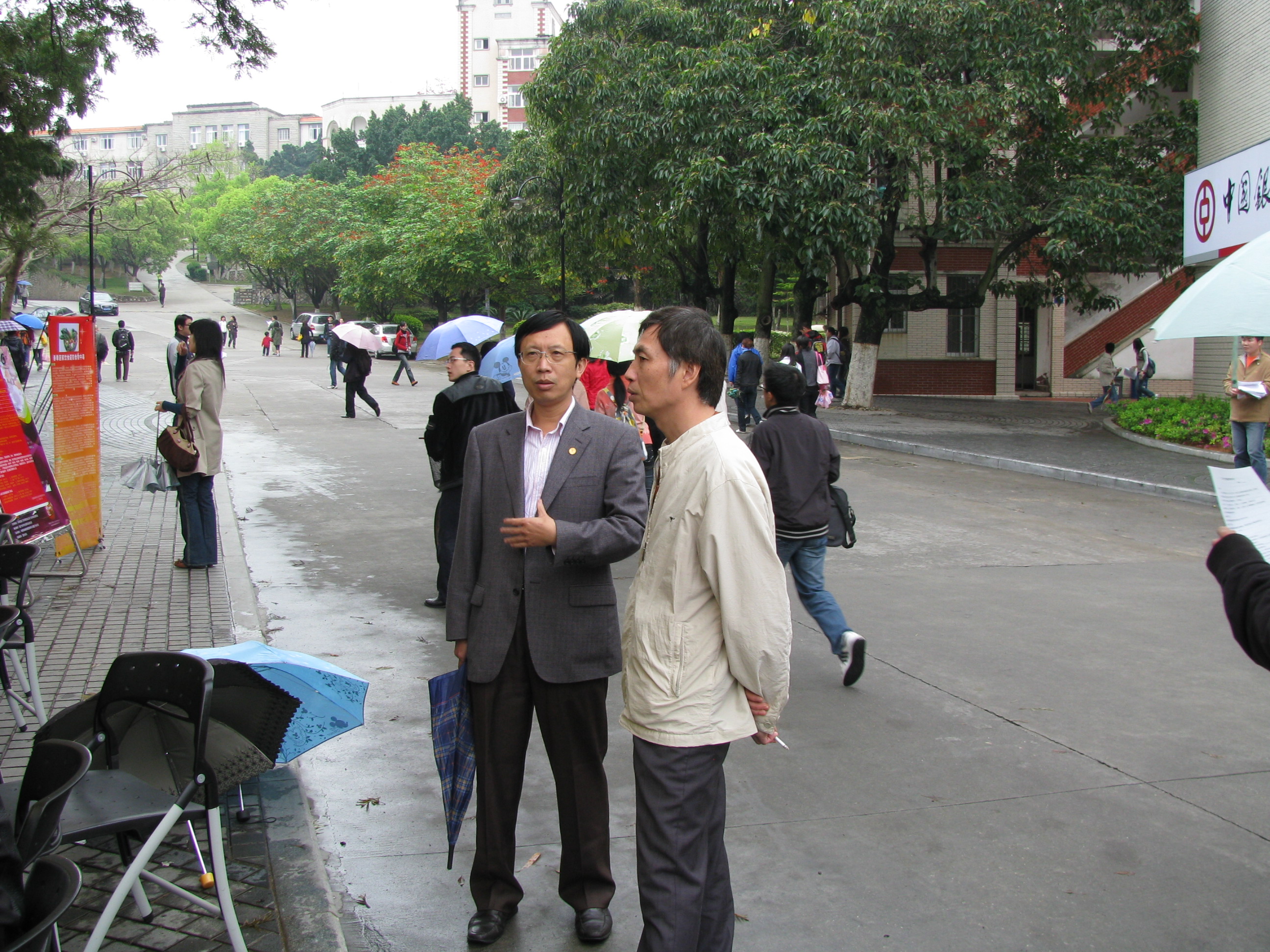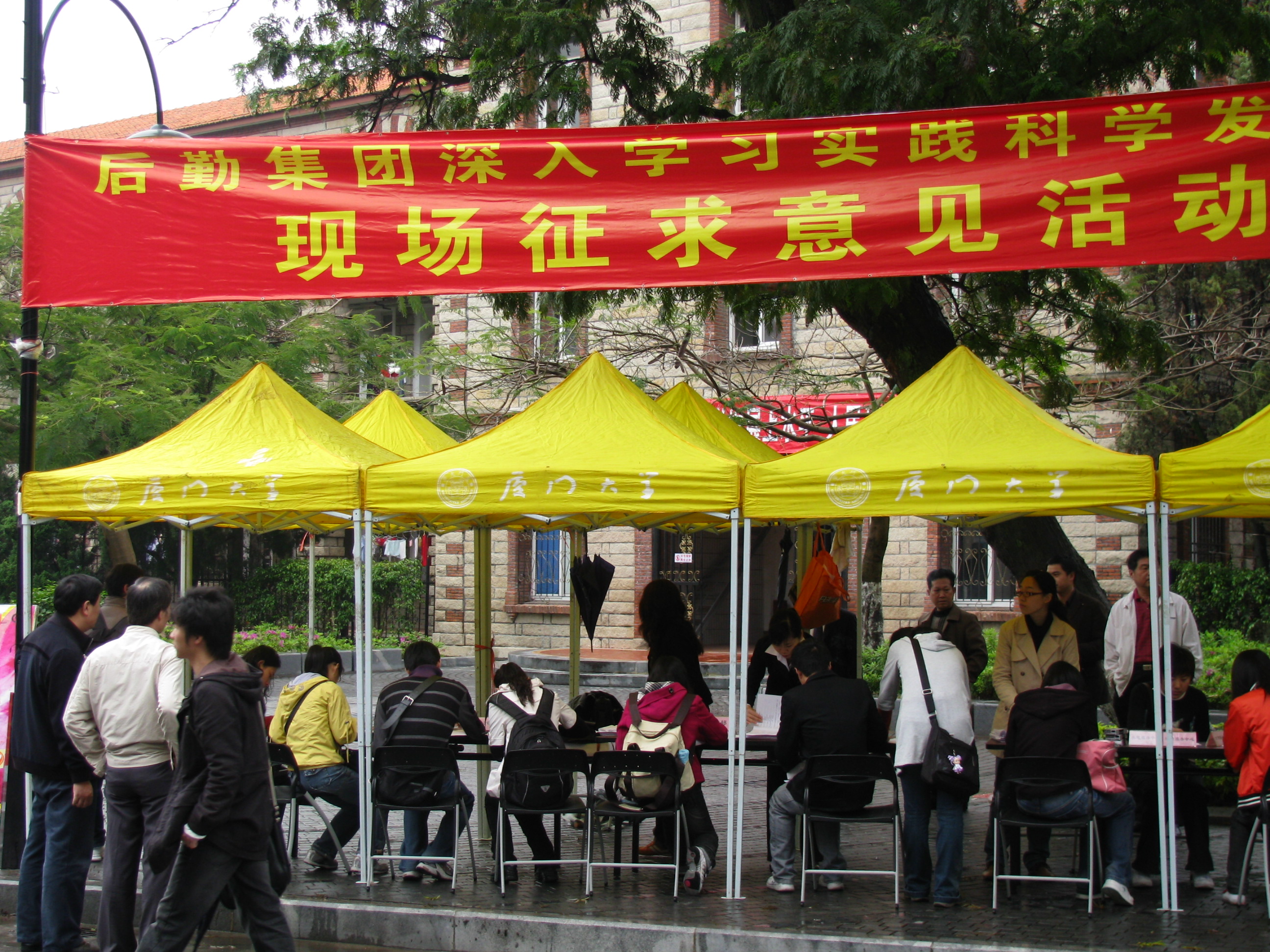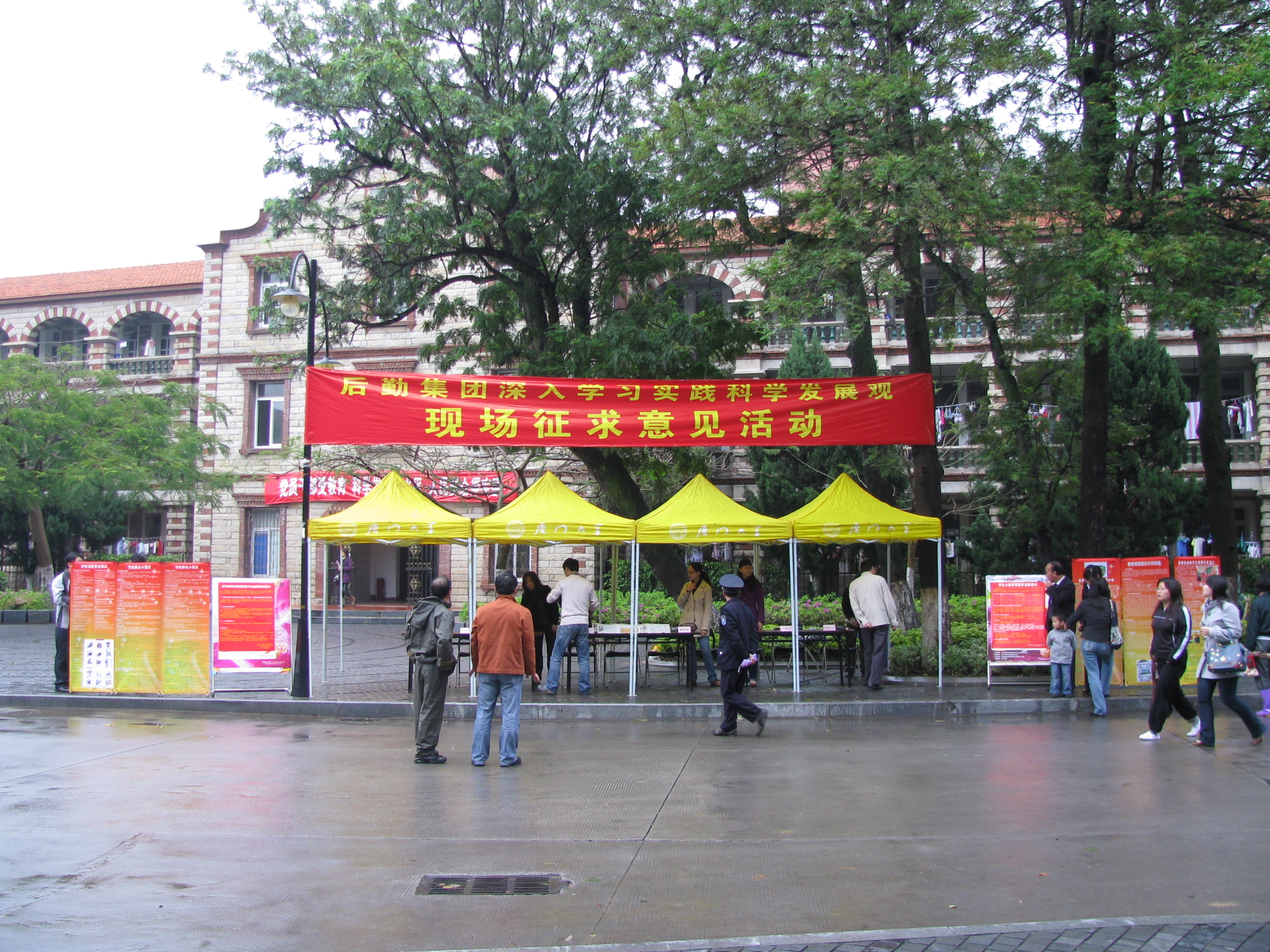 3月29日上午9点,在蒙蒙的细雨中,后勤集团深入学习实践科学发展观活动现场征求意见活动在三家村广场举行。集团党总支书记叶鹏飞、副书记庄惠美、副总经理郑庆喜等领导莅临现场和工作人员一起热情接待前来填写调查问卷的师生,真诚倾听师生的宝贵建议和意见,耐心解答师生们提出的问题。