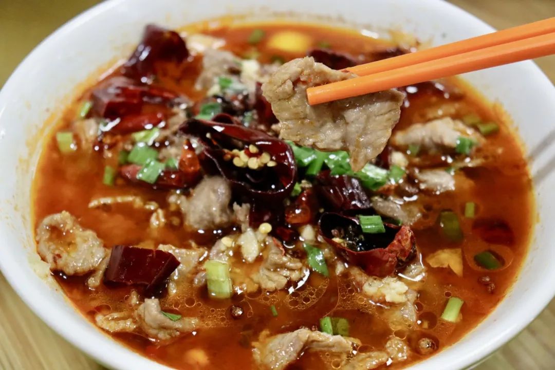 一道色香味俱佳的川菜经典,让人一尝难忘。牛肉片浸泡在红油与麻辣汤汁中,每一片都闪烁着诱人的光泽,麻辣中带有丝丝鲜香,每一口都能感受到那种麻辣鲜香在舌尖上跳跃。