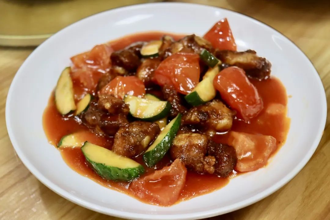 优质的排骨,经过巧妙地腌制和烹饪,色泽红亮,宛如秋日的枫叶,琥珀色的糖醋酱汁轻轻裹住每一块排骨,晶莹剔透,酸甜适中,美味难挡。