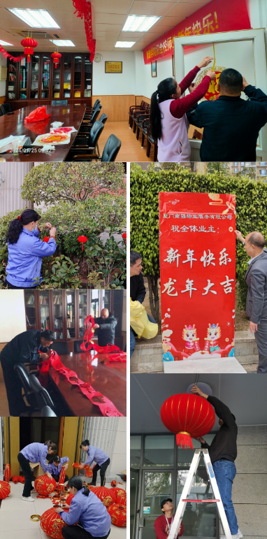 安全做底色,“中国红”来添彩。南强物业各项目精心安排,提前开展节前氛围布置工作。火红的灯笼、寓意美好的对联、精致的窗花、闪亮的彩灯装点在各处,让业主在工作、生活的同时也能感受到物业的深情祝福和对新春的期盼。