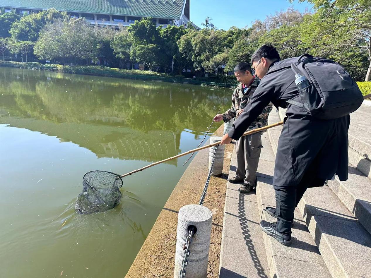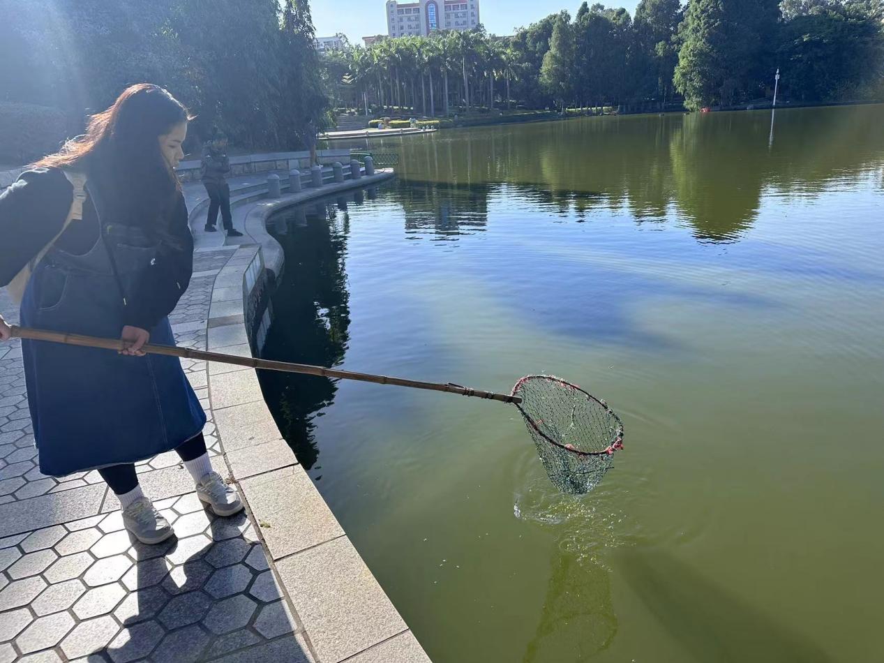 此外,绿化保洁部员工还带领中文系的学生对芙蓉湖的垃圾进行了清捞。大家干劲十足,手持长捞网,对着湖面漂浮的塑料包装袋等垃圾精准下网。