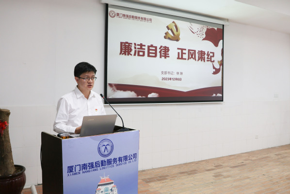 为深入学习贯彻党的二十大精神,切实加强党风廉政建设,弘扬清风正气,树立党员的责任意识、底线意识和纪律意识,着力营造风清气正、干事创业的良好政治生态,12月6日下午,南强后勤公司党支部书记林琳以《廉洁自律 正风肃纪》为主题为全体党员讲授作风建设专题党课。集团党委书记杨云良,集团副总经理、支部联系人沈雄晖到会指导。