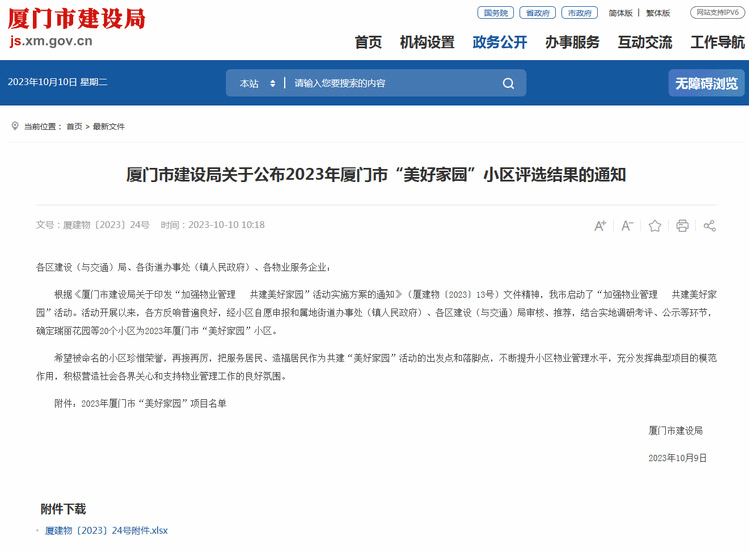 2023年10月9日,厦门市建设局公布2023年市级“美好家园”小区评选结果,厦门南强物业服务有限公司海韵北小区成功上榜!