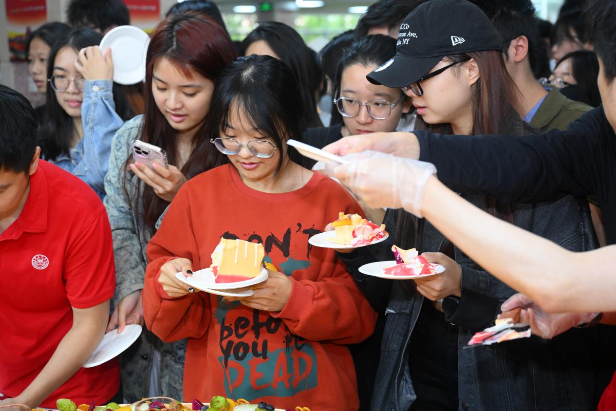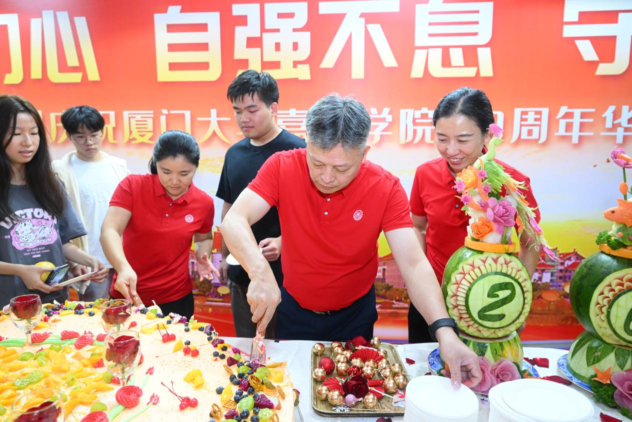 21日上午12时,南区餐厅三楼,厦门大学党委常委、漳州校区管委会主任、嘉庚学院党委常务副书记黎永强,嘉庚学院副院长雷锐生,嘉庚学院院长助理、资产与后勤管理部部长廖智军,后勤集团党委书记杨云良,后勤集团副总经理沈雄晖,后勤集团总经理助理、漳州校区服务办主任张建波和后勤集团饮食服务中心主任李东龙共同切开了象征祝福与喜悦的生日蛋糕,与在场师生欢乐分享,现场喜庆的气氛更是瞬间达到了最高潮。