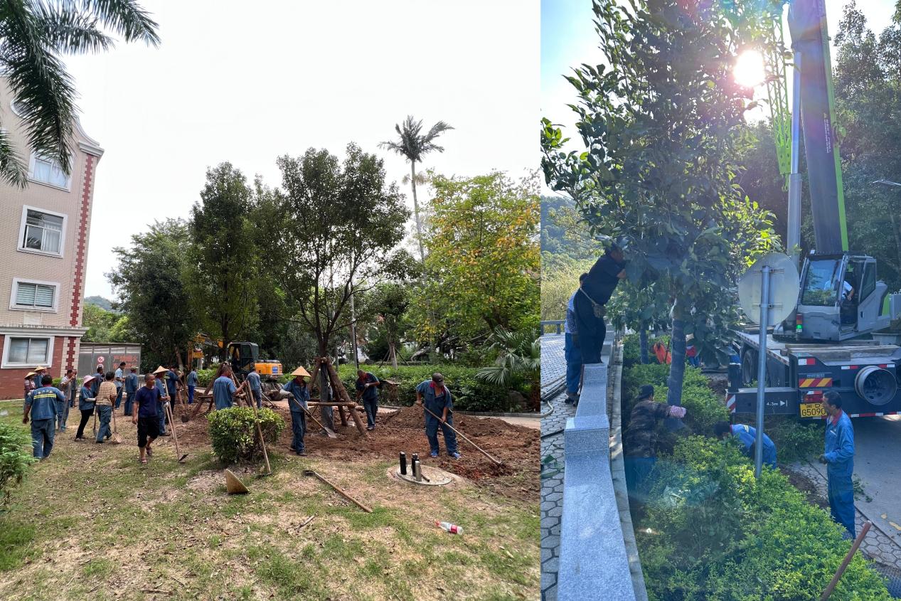 此次提升工程遇到的较大挑战是亦玄馆周边的苗木改种。亦玄馆周边原本种植的是榕树,榕树长势茂盛,易孳生蚊虫,且它的根系密集发达,向四周伸展蔓延,不仅损坏地下管道,还威胁到周边建筑物,存在安全隐患,因此改为种植香樟和茶花。由于榕树根系庞大,体积巨大,而且施工过程中还要避免损坏埋藏在土壤下的水管,这些给起挖榕树带来了极大困难。在挖掘过程中,绿化员工十分小心,在人力和吊机的密切配合下,清除20株榕树,并种下24株茶花和6株香樟。