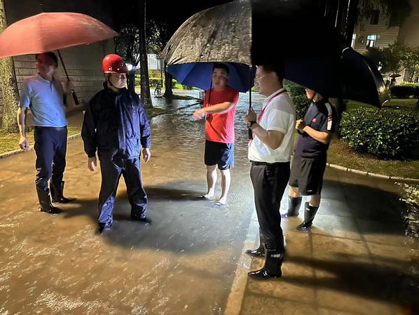 集团总经理杨旸等领导多次至群贤楼、图书馆等排涝抢险一线指导工作