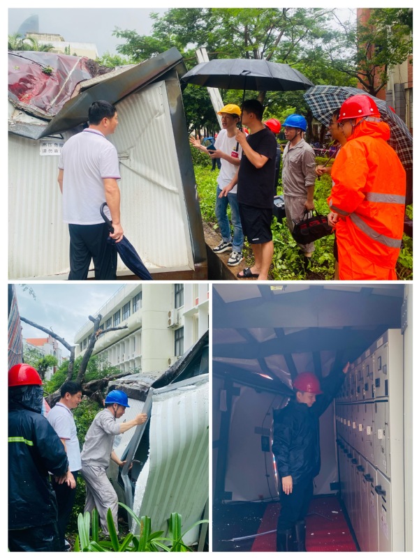 9月5日上午7点左右,思明校区南强公教片区箱变被倒伏榕树压坏,为避免高压跳闸风险,中心积极响应学校水电气科要求立即启动应急预案,对箱变进行断电检查、临时加固及防水措施。为保障该箱变供电区域师生用电正常,中心或启用双回路电源、或紧急设置临时电源,最大限度降低影响。