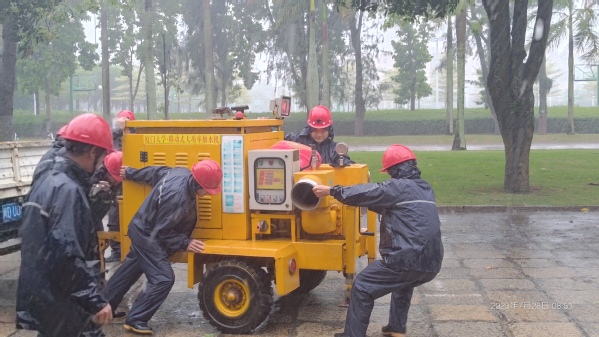 齐心协力,搬运应急抽水机至危险点备用,做好抢险救灾准备工作。