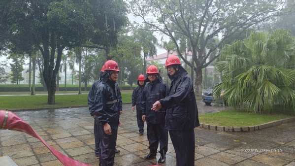 集团总经理杨旸、副总经理李启忠思明校区西校门现场关心指导防汛抗台工作。