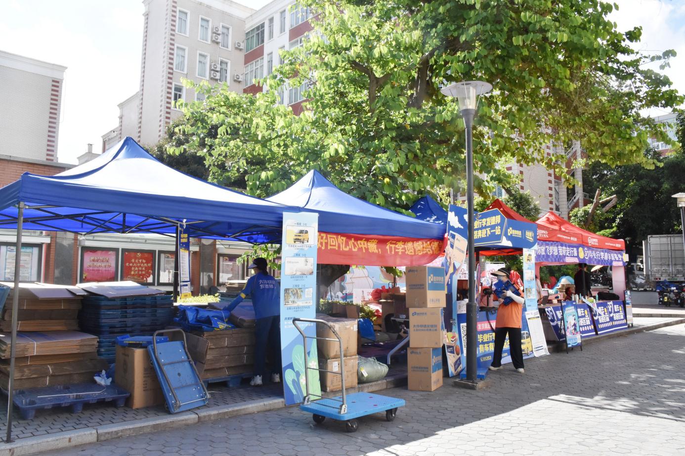 为给毕业生提供方便、安全、专业的行李托运,减轻离校负担,协调邮政、顺丰、德邦、京东快递公司入驻校内,在各园区门口设点,方便毕业生办理行李托运。