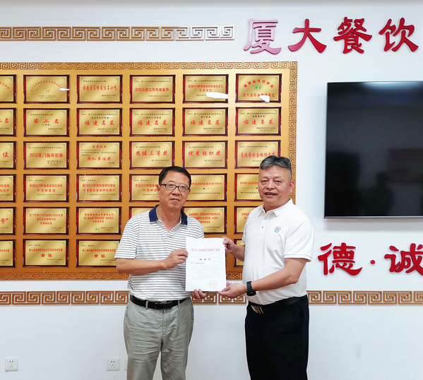 7月6日,厦门大学附属实验中学副书记张自科,总务处主任刘旸宾,副主任朱友志一行来访饮食服务中心并送来感谢信,感谢饮食服务中心长期为厦门大学附属实验中学提供高品质餐饮服务,特别是连续十二年为高考考生提供美味可口的爱心午餐等工作。