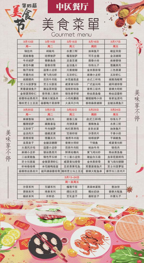 为落实“两增一降”和“质量提升”、优化师生用餐体验、丰富校园文化生活,经过紧张的筹备,中区餐厅第四届“美食节”于3月13日午餐时段在广大师生的翘首期盼中正式开幕了。