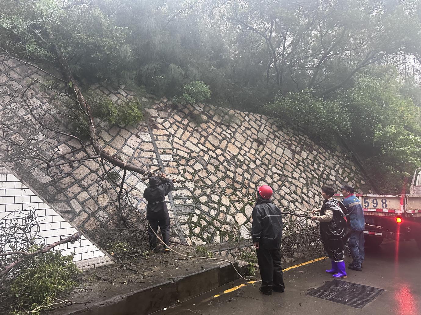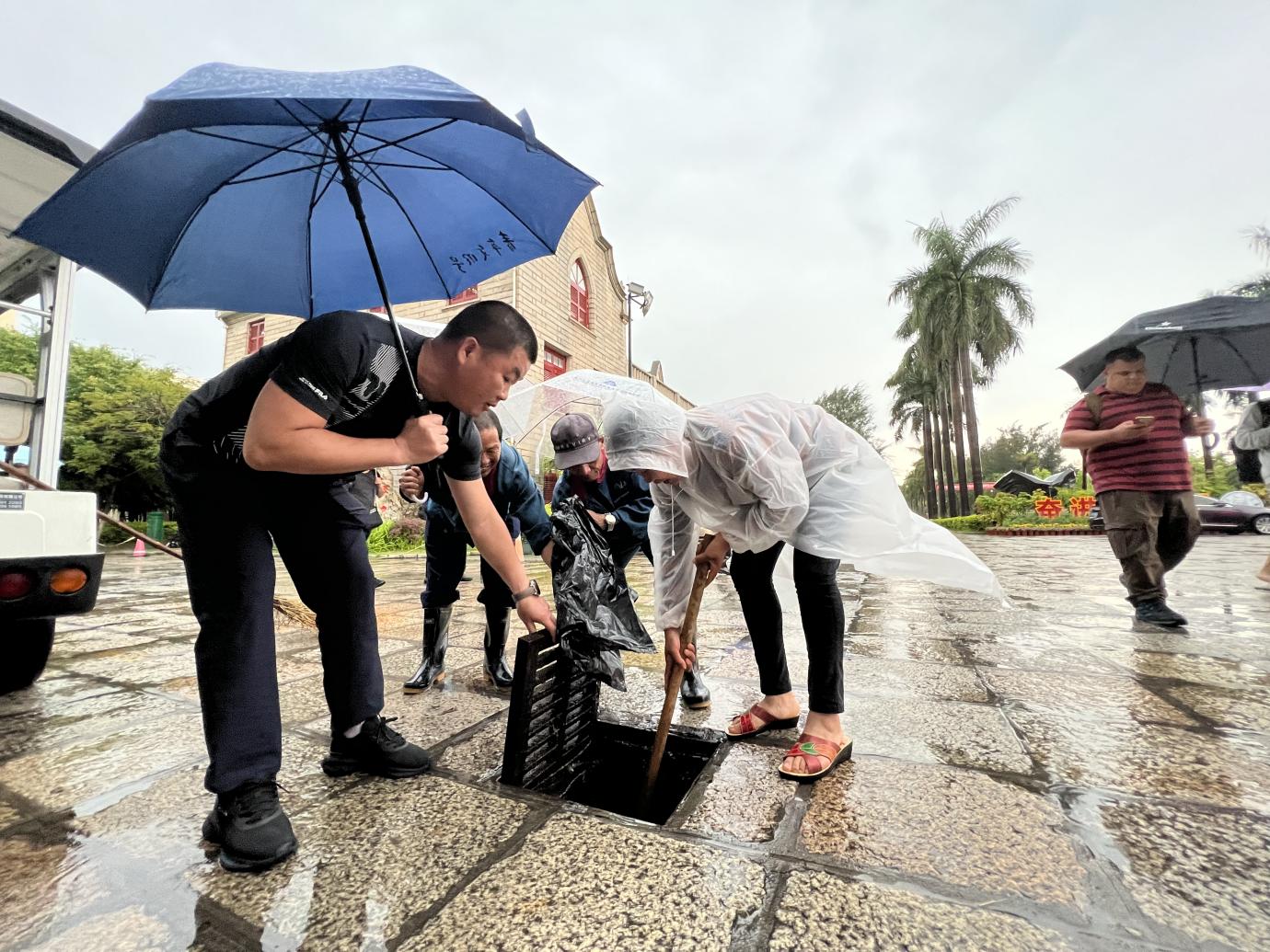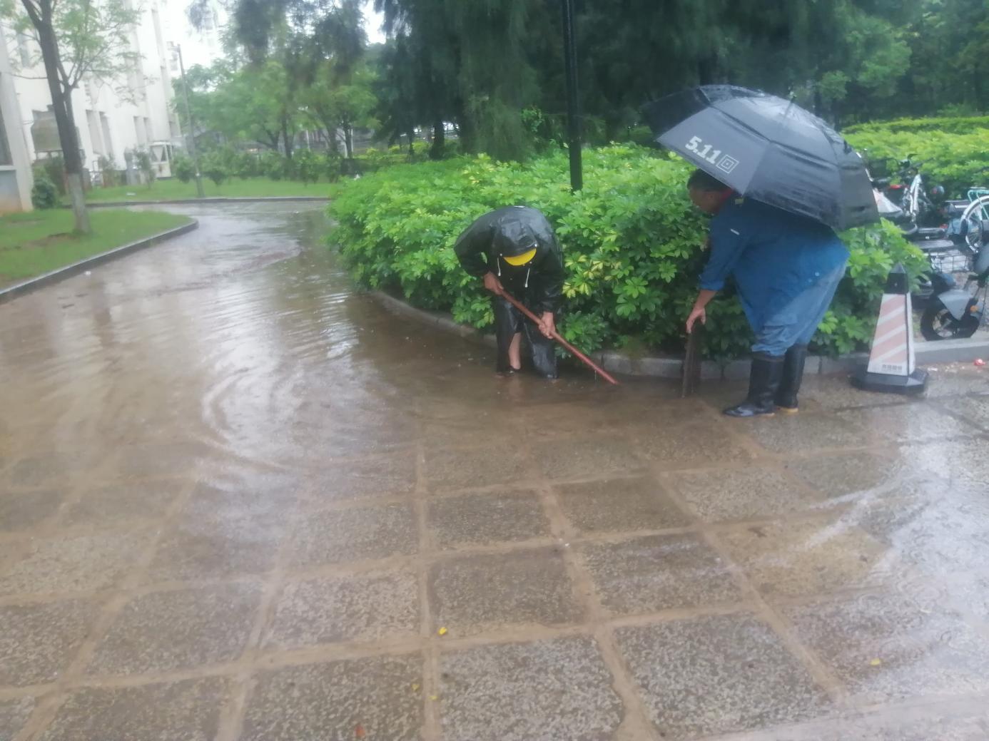 暴雨期间,突击队全面检查场馆楼顶下水管道,关好教室门窗;及时疏通宿舍园区和校园公共区域的雨污水井,确保排水通畅;及时清理倒伏树木,清除雨水沟渠里淤积的泥沙,清洗脏污路面和宿舍楼道等。