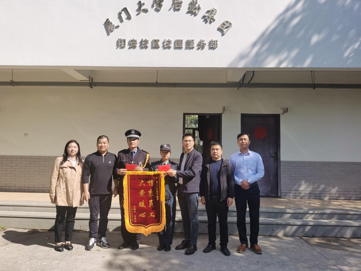 张晓冬是中心翔安校区校园服务部安防员,妻子李蜨治在厦门南强物业服务有限公司上班,家中因意外着火经济损失严重,导致生活困难。李启忠代表集团送上爱心资金,并详细了解他们的工作和生活现状,鼓励他们用积极乐观的心态面对生活中的困难。